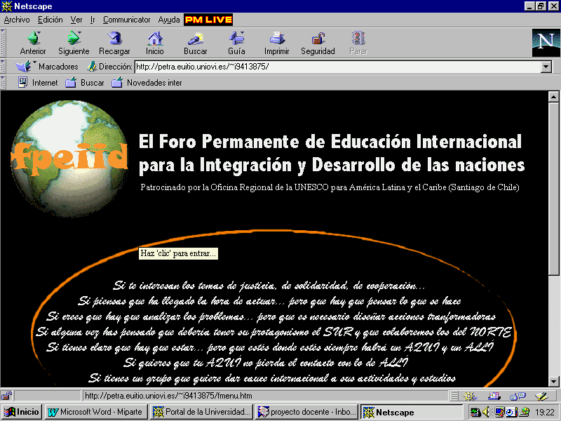RESUMEN: Una de las grandes novedades que han sido factibles a partir de la existencia de la red Internet es la creación de comunidades virtuales, concebidas a modo de foro de intercambio y realización de proyectos con afinidad de intereses. Esto ha supuesto la superación de las barreras espacio-temporales, y ha posibilitado el encuentro en el ciberespacio de personas de diferentes nacionalidades, formación profesional,..., con intención de potenciar grupos de trabajo para la cooperación y el desarrollo.